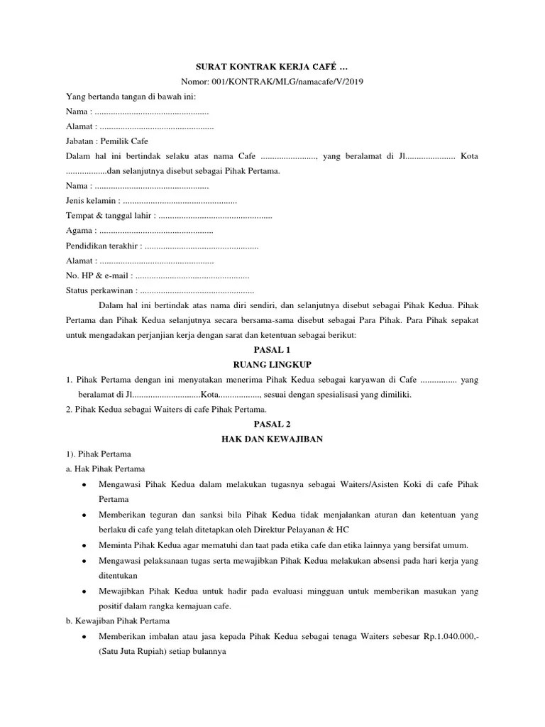 Membuat surat perjanjian kerja (spk) atau kontrak kerja menjadi suatu kewajiban bagi karyawan baru. Surat kontrak kerja adalah surat yang dibuat oleh pihak pemberi kerja (perusahaan) dengan si penerima kerja (karyawan) yang mana isinya kesepakatan antara kedua belah pihak tersebut. Kontrak kerja dalam smk anggota polri. Jangan asal kerja, surat kontrak kerja karyawan swasta perlu kamu punya. Surat kontrak kerja merupakan surat resmi yang di dalamnya berisi tentang perjanjian yang dilakukan oleh kedua pihak. Menciptakan ketertiban dan kepastian dalam segala hal yang. Saat masuk bekerja di sebuah perusahaan pertama kali sebelumnya pasti anda menandatangani kontrak kerja. 3.2 surat perjanjian kerja karyawan kontrak. 5 langkah yang harus diperhatikan dalam membuat kontrak kerja karyawan. Pastikan di dalam surat tersebut terdapat berapa. Kontrak atau perjanjian kerja adalah kesepakatan dalam bentuk tertulis atau lisan yang dibuat untuk mengikat hubungan antara pekerja atau buruh dengan pengusaha, dalam periode waktu tertentu. Sehingga anda perlu memerhatikannya dengan teliti mengenai. Seseorang yang melakukan perjanjian kerja semacam ini sering disebut karyawan kontrak.